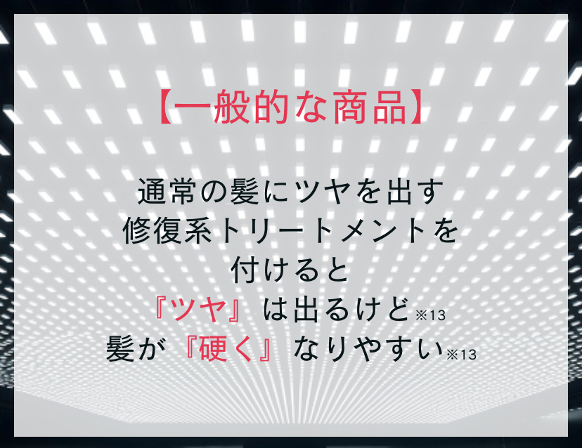 通常、髪内部を強化すると硬くなってしまうという課題※8がありましたがこの商品は独自の技術により、仕上がりは柔らかく、ツヤ感※8とまとまりが格段に向上します。